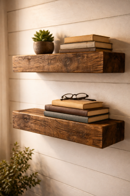 - How to Build It: Sand the boards thoroughly, starting with 80-grit sandpaper and working your way up to 220-grit for a smooth finish. Apply a dark walnut or weathered gray wood stain, followed by a coat of matte polyurethane. To make them “float,” drill deep holes into the back edge of the board and slide them onto heavy-duty steel floating shelf brackets mounted to your wall studs.